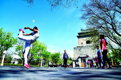 居民在钟鼓楼广场踢毽子。张传东摄/光明图片